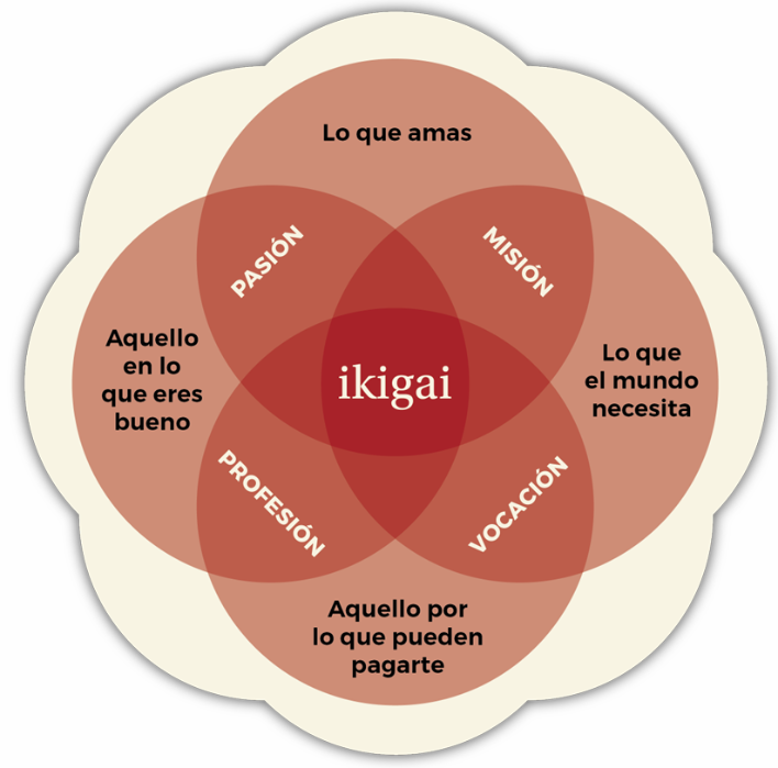IKIGAI, un proceso de búsqueda, personal y continuo que conduce a un equilibrio entre lo que uno ama hacer, en lo que es bueno, por lo que te pueden pagar y lo que el mundo necesita.